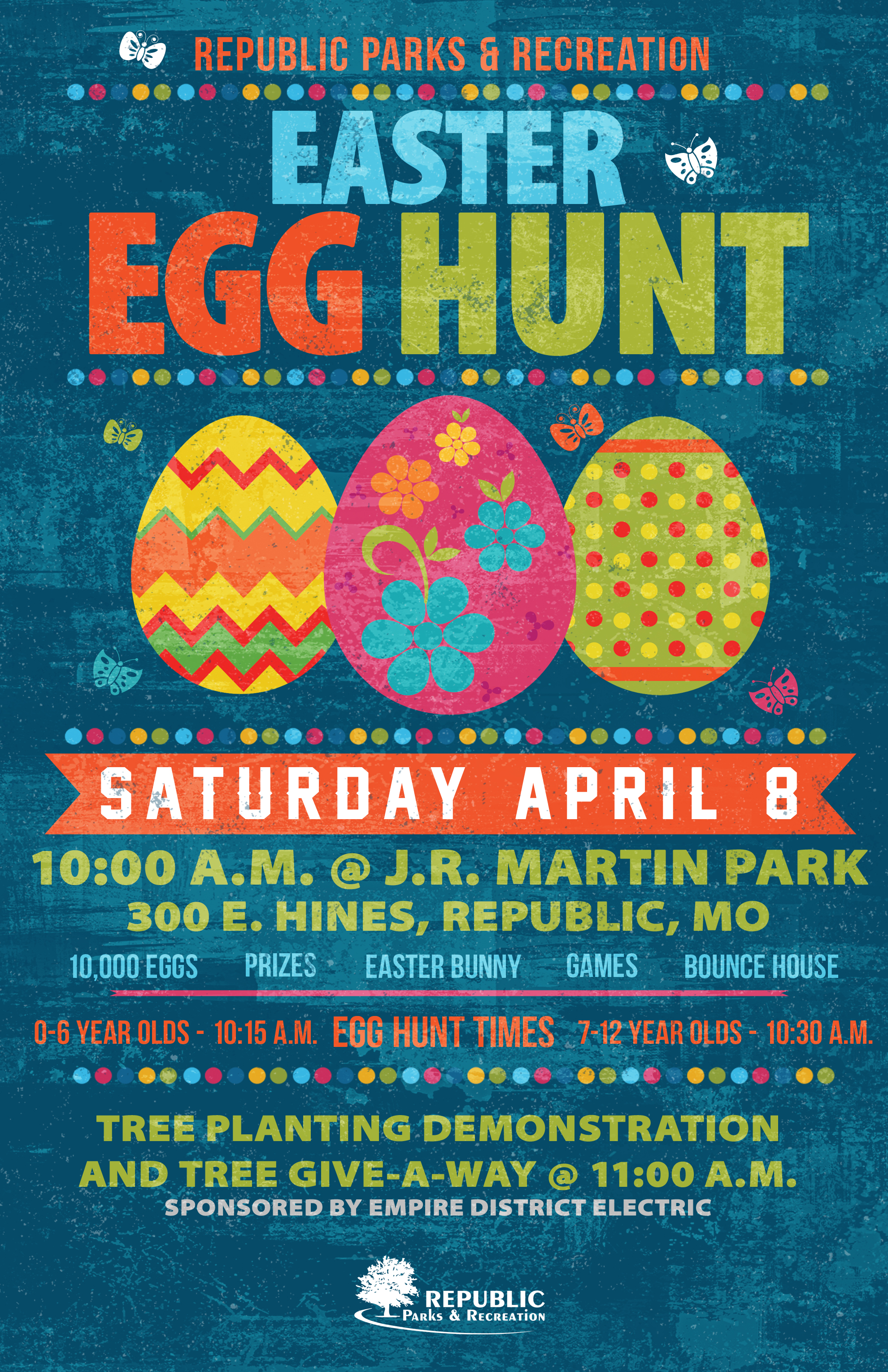 The Republic Parks & Recreation Department is hosting the annual Easter Egg Hunt on Saturday, April 8 from 10:00 a.m. – 12:00 p.m. at J.R. Martin Park (300 E. Hines) and it will feature 10,000 eggs, games, a bounce house, a visit from the Easter Bunny, prizes, and more! The official egg hunts will begin at 10:15 a.m. with the 0-6 year olds and 10:30 a.m. with the 7-12 year olds. A tree planting demonstration and tree give-a-way, sponsored by Empire District Electric, will begin at 11:00 a.m.